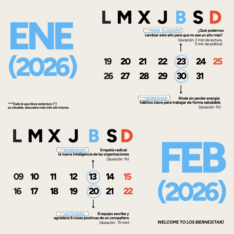 Nuestro Calendario de Biernes(tar) 2026 nace para eso: ayudar a RRHH a integrar el bienestar en la agenda anual, de forma realista y sostenible.